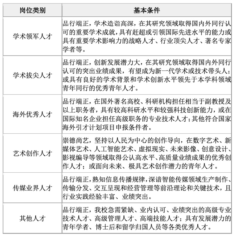 学校急需坚持立德树人,教学科研能力突出,符合学校学科建设发展和人才培养需要的各类人才,包括新闻传播学、戏剧与影视学、艺术学理论、信息与通信工程、音乐与舞蹈学、设计学、中国语言文学、美术学、应用经济学、政治学、马克思主义理论、外国语言文学、电子科学与技术、计算机科学与技术、网络空间安全、管理科学与工程、公共管理等一级学科和信息传播学、数字艺术、互联网信息、文化产业、新媒体、艺术与科学等交叉学科领域人才。