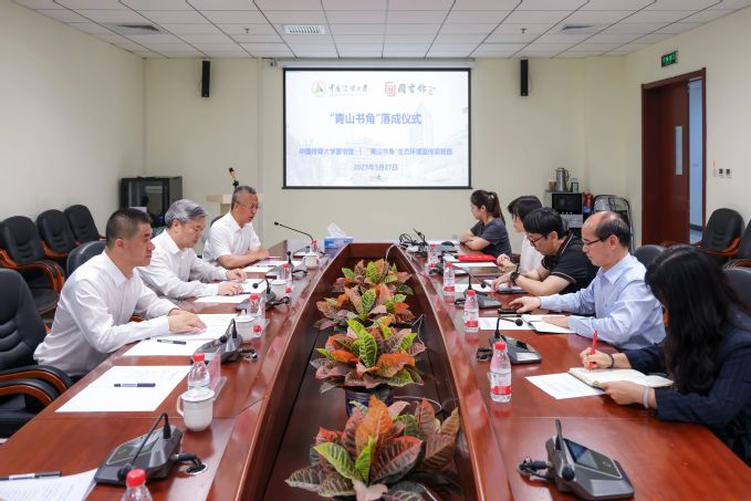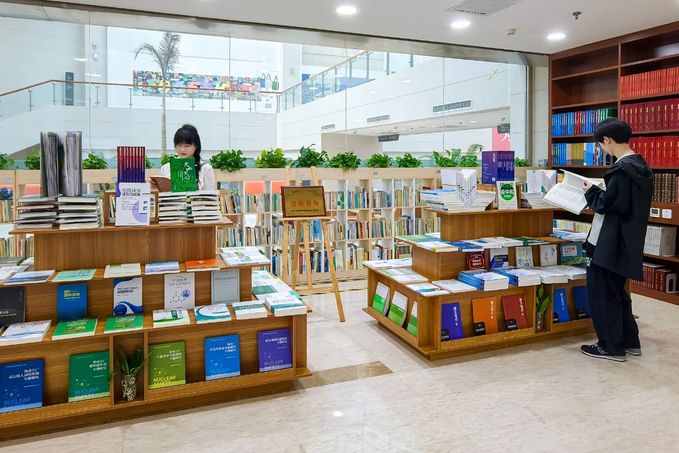 仪式结束后,全体嘉宾参观了刚刚落成的“青山书角”。书角位于图书馆一层西区,设计简约雅致,书架上整齐陈列着有关生态文明思想阐述、生态环保政策解读、生态环境与国际发展等书籍,吸引众多师生驻足翻阅。